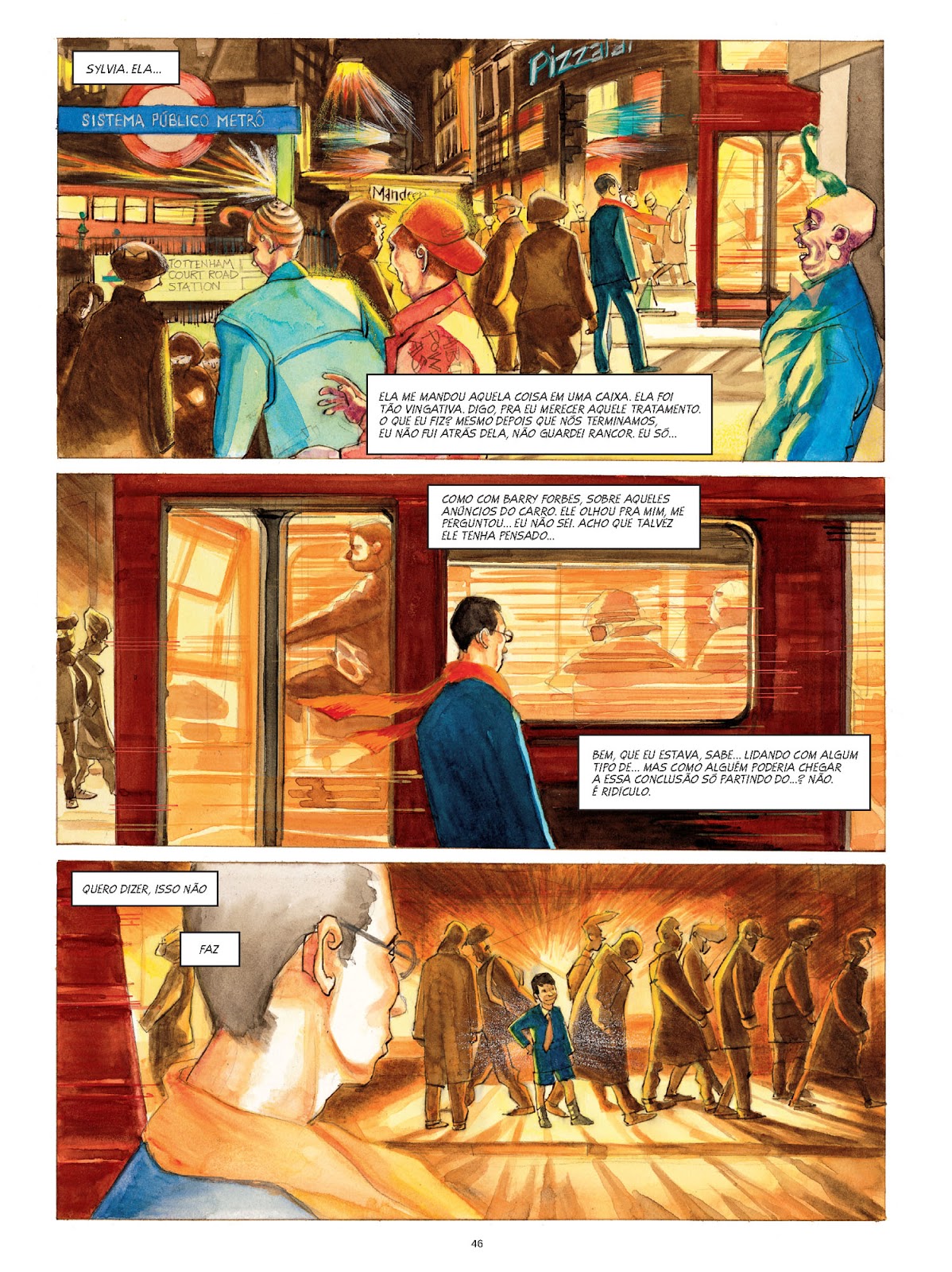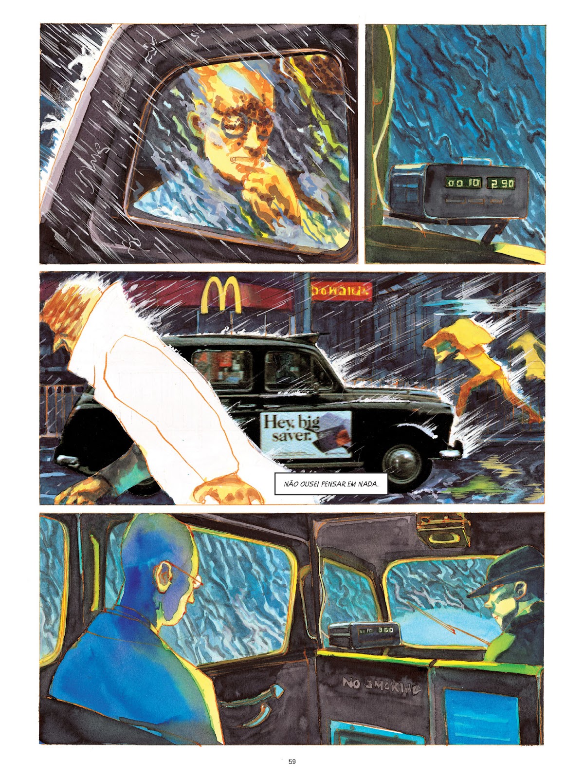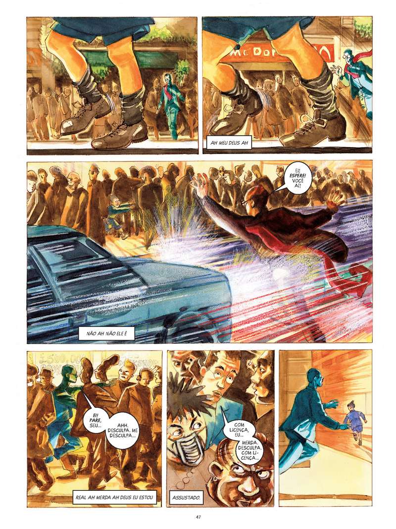 A arte de Zárate varia de acordo com a situação: se identificam o tempo presente, os flashbacks e delírios surreais do protagonista pelo visual das cenas, que diferem entre si. A parte da história passada no “presente”, por exemplo, é carregada de tons muito quentes e vivos, muito semelhante à escola de arte Fauvista. Já os flashbacks são páginas com a pintura levemente esmaecida. então não vá reclamando que algumas páginas tiveram defeito de impressão. SejE mais sensível!!! :>)))).